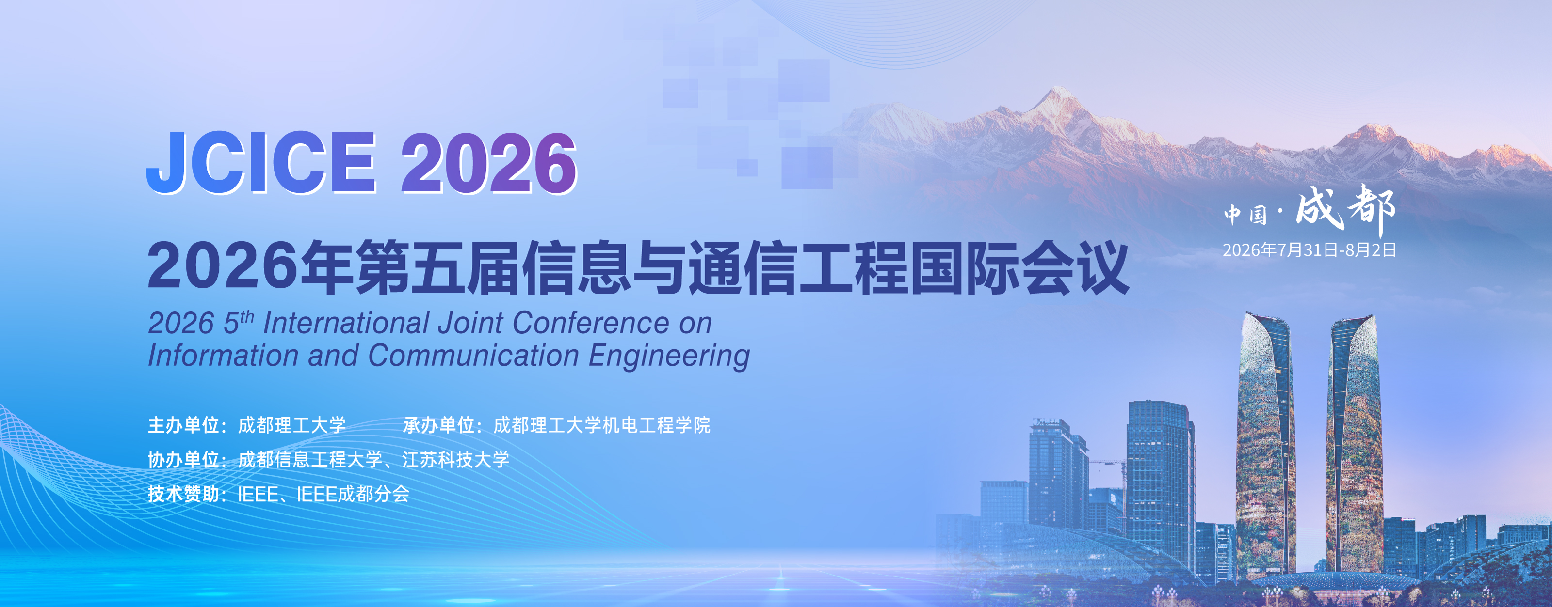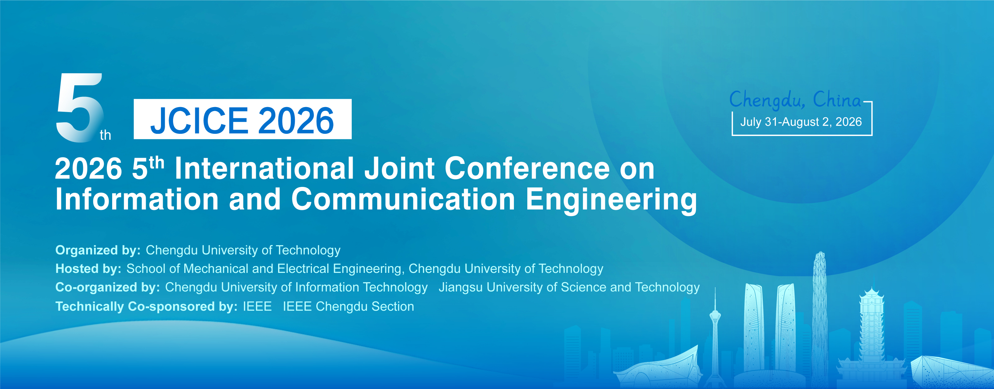 It is with great pleasure that we invite you to the 2026 5th International Joint Conference on Information and Communication Engineering (JCICE 2026) which is scheduled to be held in Chengdu, China on July 31-August 2, 2026. JCICE 2026 is organized by Chengdu University of Technology, hosted by School of Mechanical and Electrical Engineering, Chengdu University of Technology, co-organized by Chengdu University of Information Technology and Jiangsu University of Science and Technology, and technically co-sponsored by IEEE and IEEE Chengdu Section.