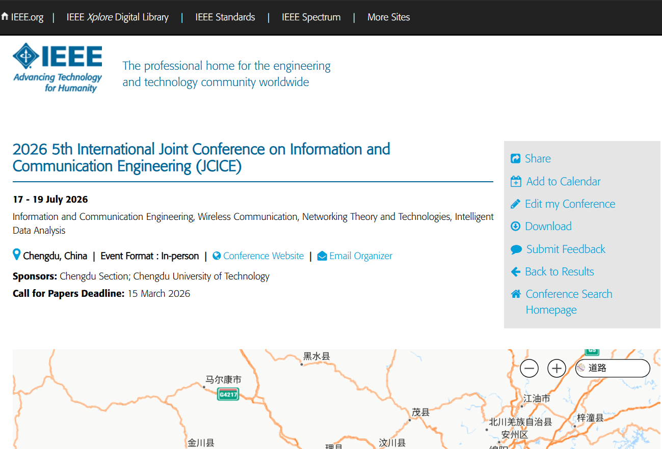 It is with great pleasure that we invite you to the 2026 5th International Joint Conference on Information and Communication Engineering (JCICE 2026) which is scheduled to be held in Chengdu, China on July 17-19, 2026. JCICE 2026 is organized by Chengdu University of Technology and Chengdu University of Information Technology, hosted by School of Mechanical and Electrical Engineering, Chengdu University of Technology, co-organized by Jiangsu University of Science and Technology, and technically co-sponsored by IEEE and IEEE Chengdu Section.